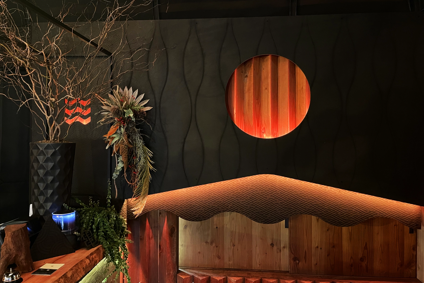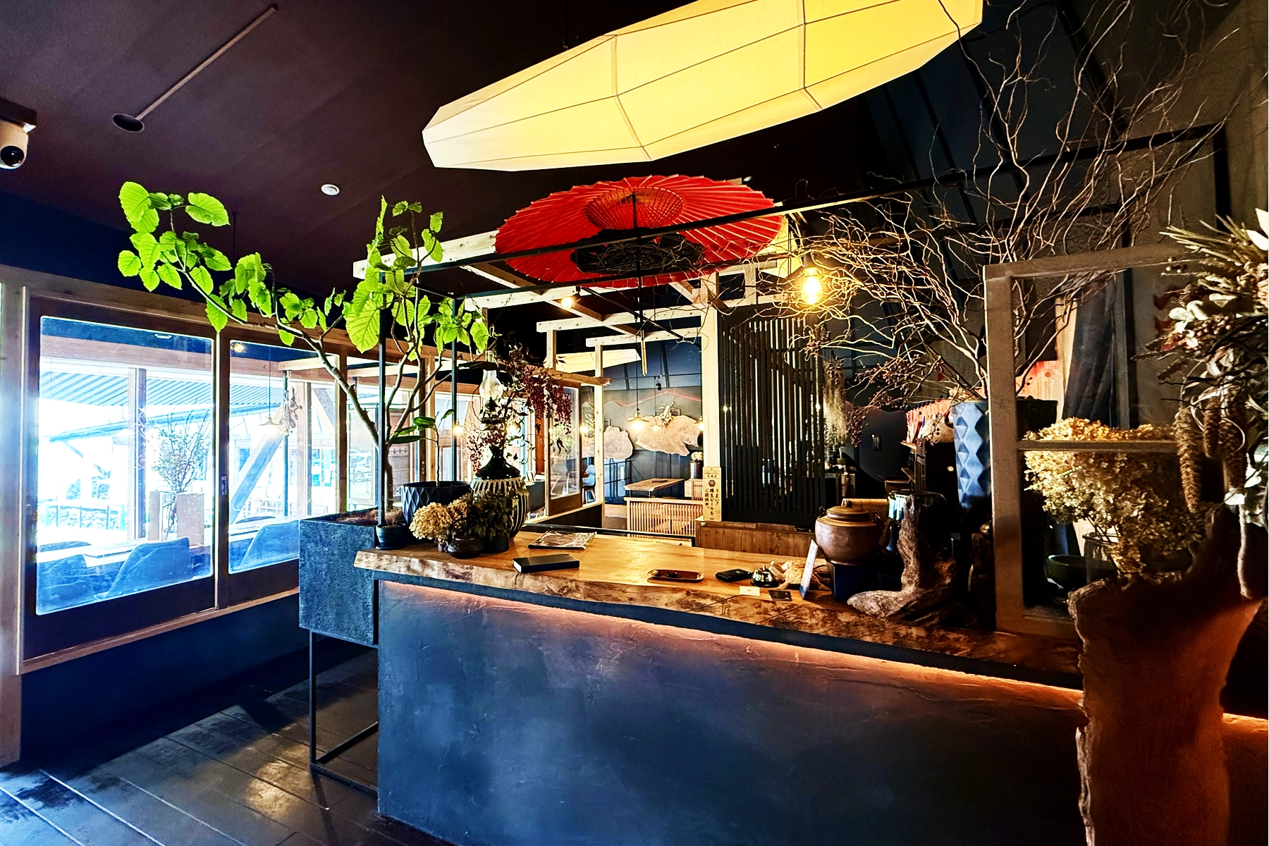 フロアはブラックベースに古民家から移築した建具を揃え、木の温もりが感じられる落ち着いた上質な空間が広がります。 入浴前でも入浴後でもゆっくりくつろいでお食事していただけます。